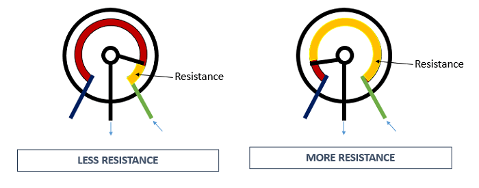 To use the potentiometer as a rheostat, only two pins are used: one outside pin and the center pin. The position of the wiper determines how much resistance the potentiometer is imposing to the circuit, as the figure demonstrates: