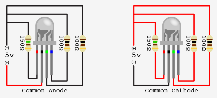 - there are two kinds of RGB LEDs: common cathode and common anode RGB LEDs;