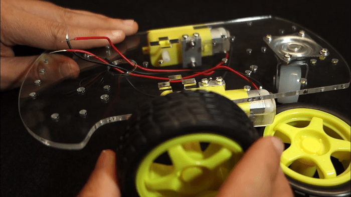 11)Â Lastly, Â connect the wheels to the DC motors.