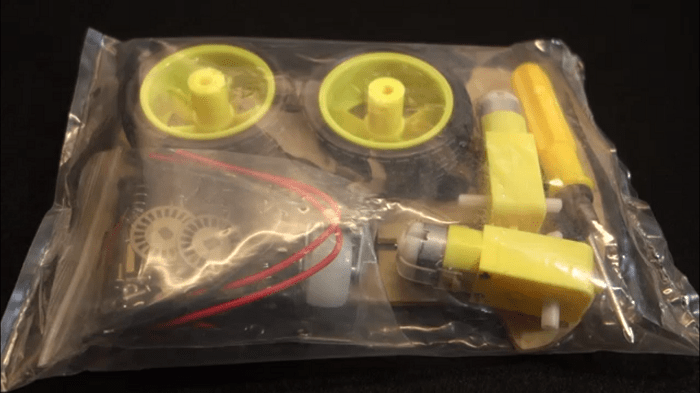 2) Open the package – it comes with one screwdriver, two DC motors, two wheels and one acrylic car chassis. There is also a small plastic bag that comes with a battery holder, a small wheel for the front, some bolts and screws, four wires and other required components to assemble the robot.