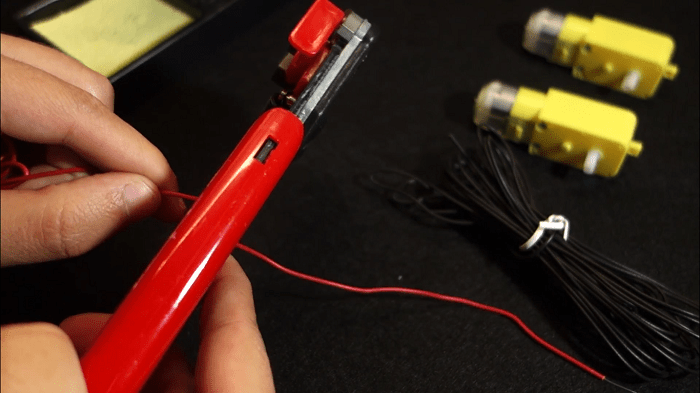 3) Although this kit comes with the needed wires, since they are a bit short and not very flexible, we’ve decided to replace them with other wires, because we can easily adjust their length. You’ll need one red wire and one black wire for each motor. You can use a wire cutter to cut the wires to your desired length.