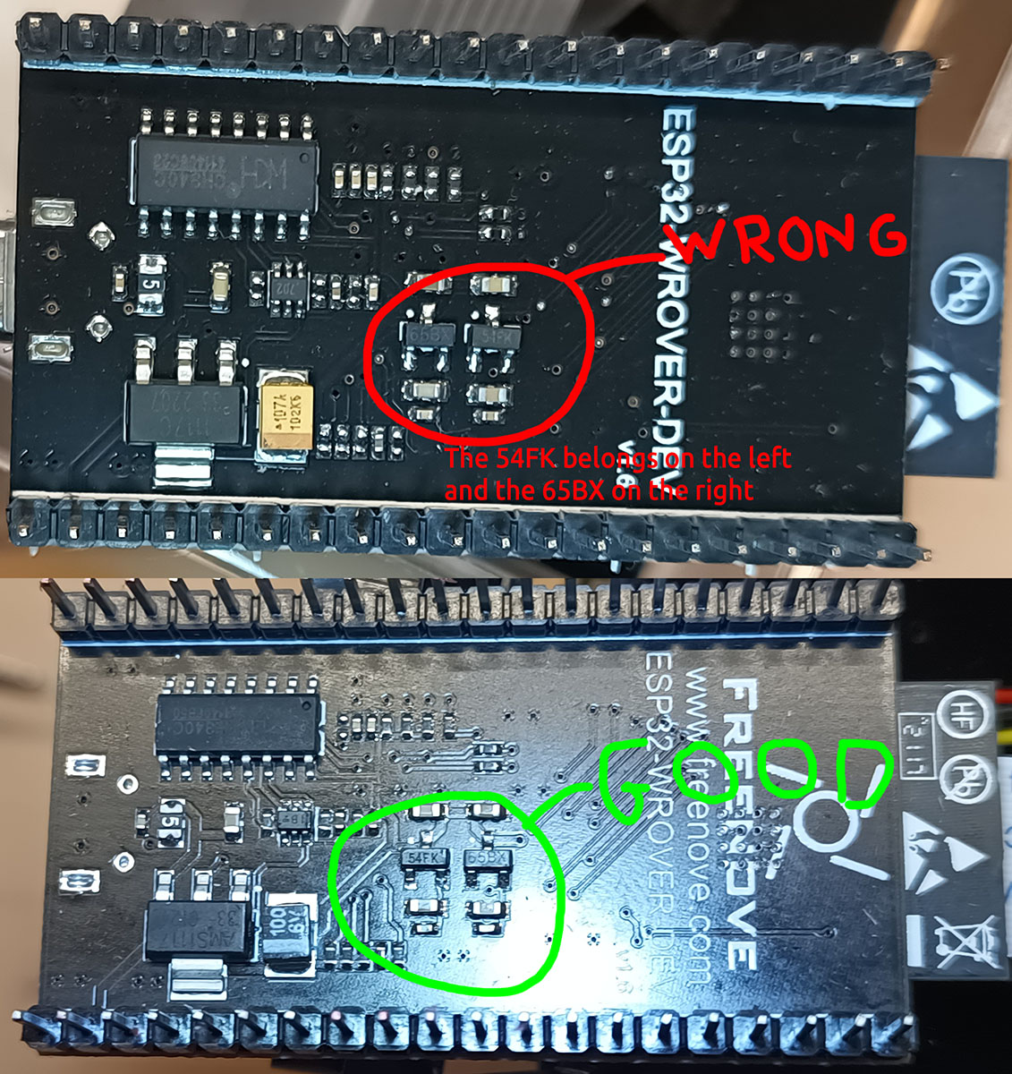 If your ESP32-WROVER-DEV doesn’t detect the camera, you’ve got a cheap copy board: You need to swap the 2 power regulators (65BX and 54FK) which got soldered in the wrong way around! See pic – cheap copy at top, original at bottom :-
