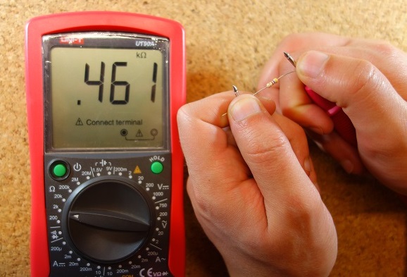 Plug the red probe into the right port and turn the selection knob to the resistance section. Then, connect the probes to the resistor leads. The way you connect the leads doesn’t matter, the result is the same.
