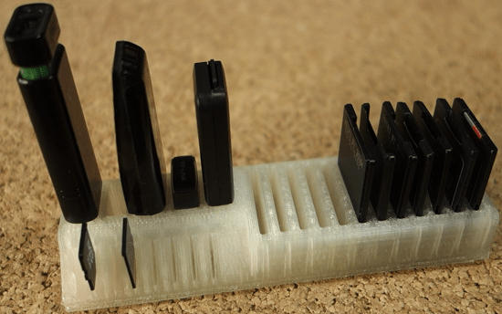 My second print was a holder for SD cards, micro sd cards and USB drives.I have a lot of SD and micro SD cards that I frequently use with my Raspberry Pi and cameras, so this turned out to be a useful item that I’ll always have on my desk.