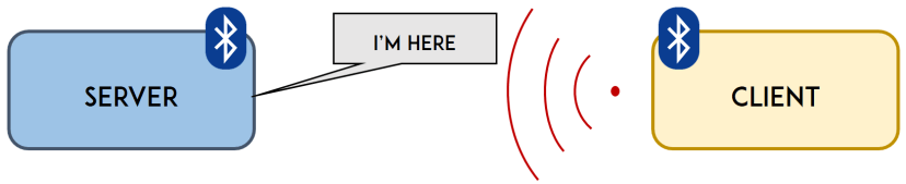 The server advertises its existence, so it can be found by other devices, and contains the data that the client can read. The client scans the nearby devices, and when it finds the server it is looking for, it establishes a connection and listens for incoming data. This is called point-to-point communication.