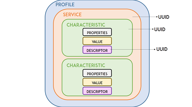 The top level of the hierarchy is a profile, which is composed of one or more services. Usually, a BLE device contains more than one service.